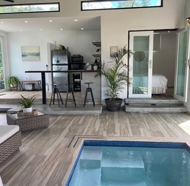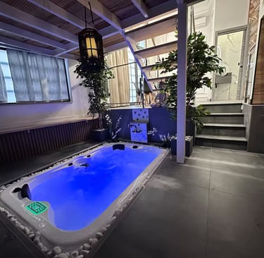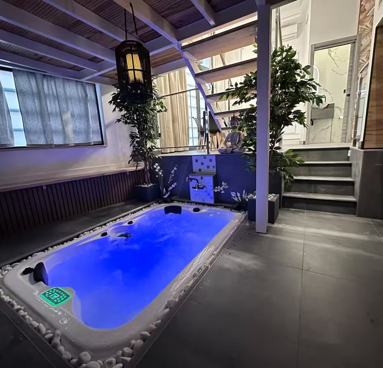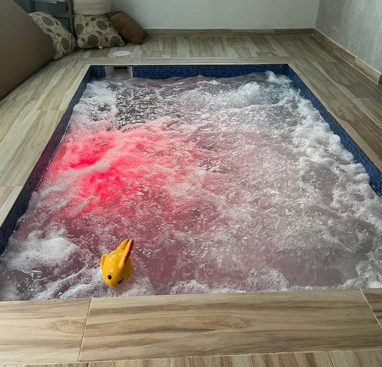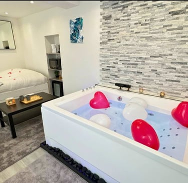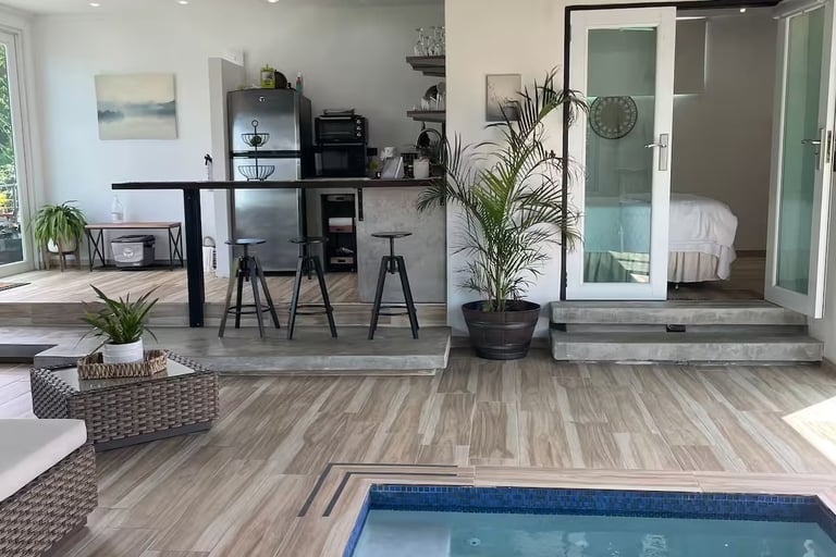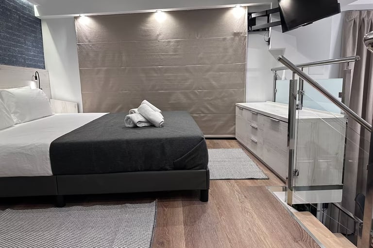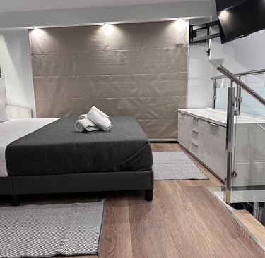 Lujoso y sencillo piso tipo estudio equipado con jacuzzi privado de tipo hidromasaje, calefacción, aire acondicionado, Wifi, servicios de streaming (Netflix, HBO, Prime, Disney+) y servicio adicional de decoración romántica. Pet friendly