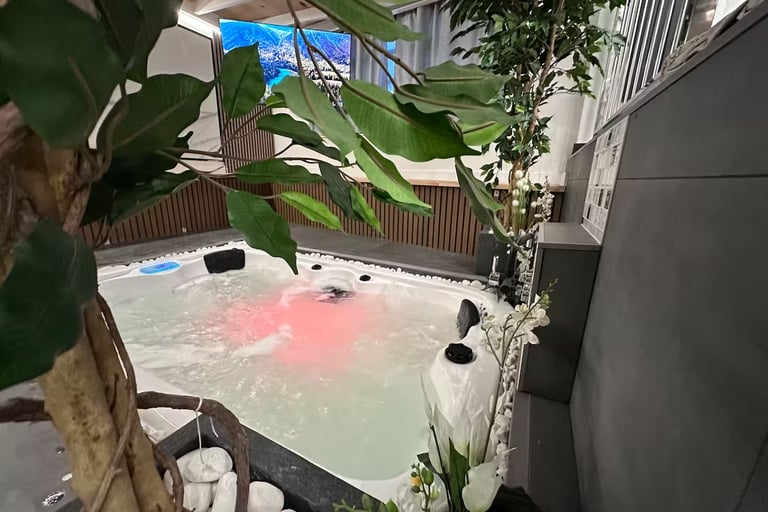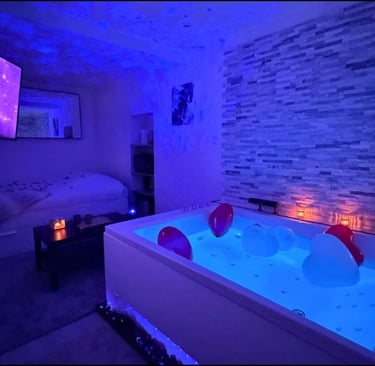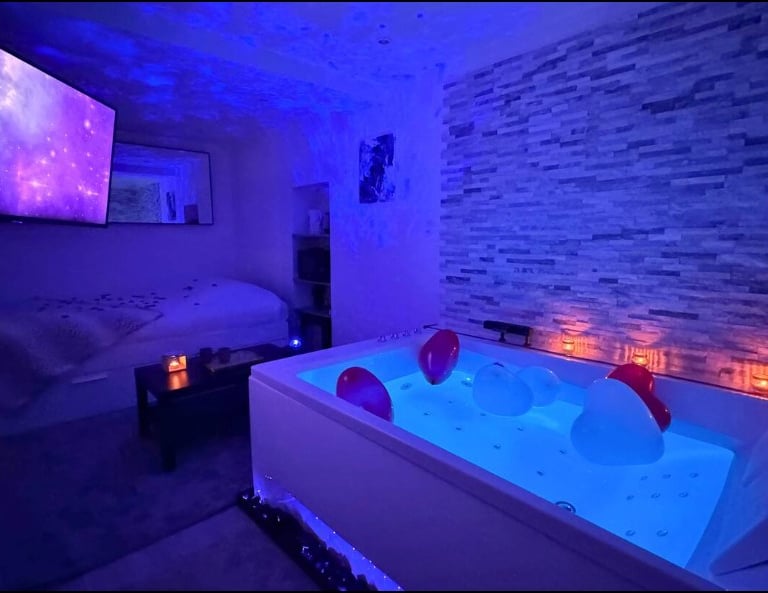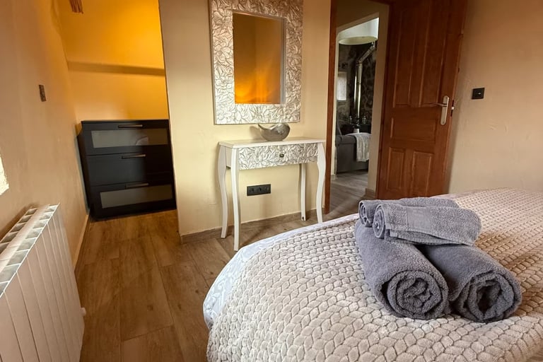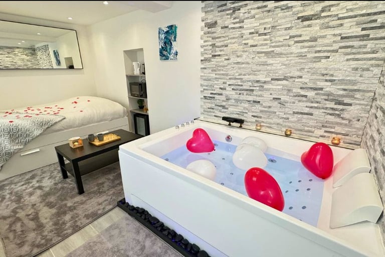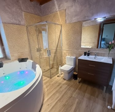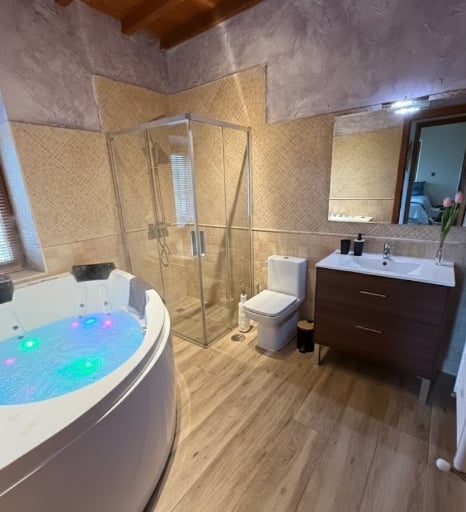Piso totalmente equipado con jacuzzi privado en el salón, chimenea, aire acondicionado, Wifi, servicios de streaming (Netflix, HBO, Prime, Disney+) y servicio adicional de decoración romántica. Pet friendly