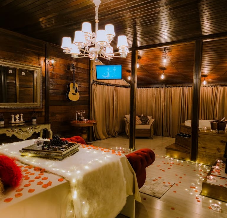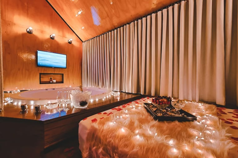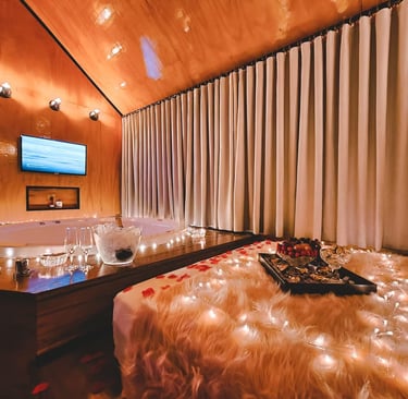 Cabaña privada con jacuzzi, chimenea, Wifi, servicios de streaming (Netflix, HBO, Prime, Disney+) y servicio adicional de decoración romántica. Pet friendly