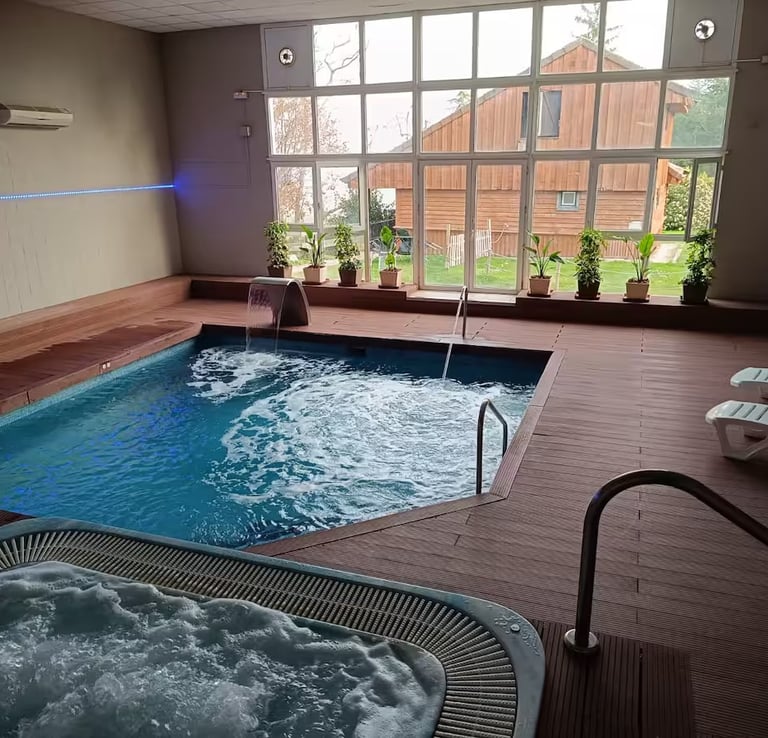 Lujosa cabaña familiar equipada con jacuzzi privado de tipo hidromasaje, piscina climatizada, chimenea, aire acondicionado, Wifi, servicios de streaming (Netflix, HBO, Prime, Disney+) y servicio adicional de decoración romántica. Pet friendly